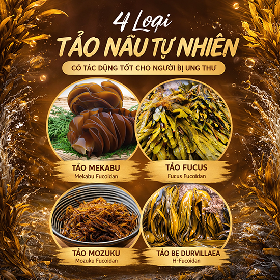 Tảo Fucus: theo Heathline thì Fucus Fucoidan có thể làm chậm sự phát triển của khối u đại trực tràng và ung thư vú. Một nghiên cứu khác đăng trên Thư viện Y khoa Quốc gia Mỹ cũng cho thấy, loại fucoidan này còn có thể hỗ trợ chống viêm, giảm nhẹ các triệu chứng đau khớp và tác dụng phụ của hóa, xạ trị.